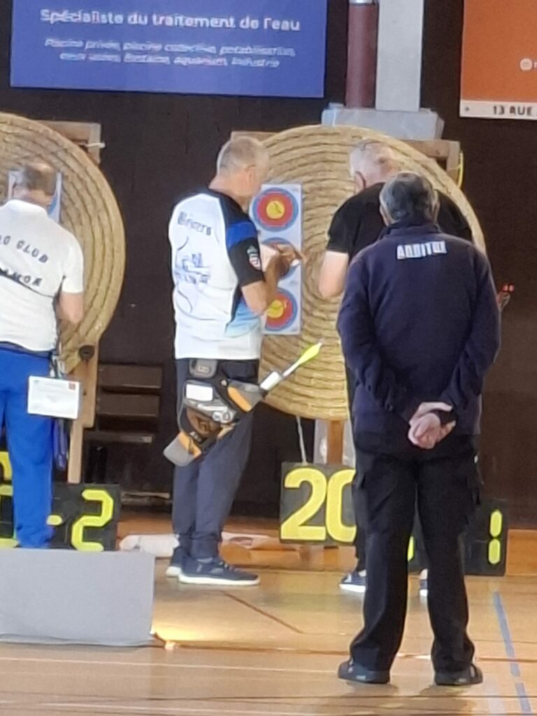 Un petit vécu personnel pour Alain: Très satisfait du matin en trispot puisque c’est mon 3eme meilleur score de la saison avec 508 sans aucune paille (en dehors du 6 sur trispot c’est 0/paille) et je finis 5eme en classement de qualification (meme si quelques bas sur certaines volées). Les duels ont été en montagne russe. J’ai gagné le 1/16 malgré plusieurs pailles, certes je rencontrais le 28eme au classement, ce qui a aidé, il a fait plus de paille que mois. J’ai gagné le 1/8 avec de très belles volées, 3×27, 1×25 et même un 30. J’aurai du me réserver ces beaux tirs pour le 1/4 de finale, ou j’ai perdu avec une volée à 2 pailles, certes contre le 4eme des qualifications qui a gagné le championnat. Ambiance toujours très sympathique entre les « vieux » qui se battent sans animosité ni volonté de gloriole.
